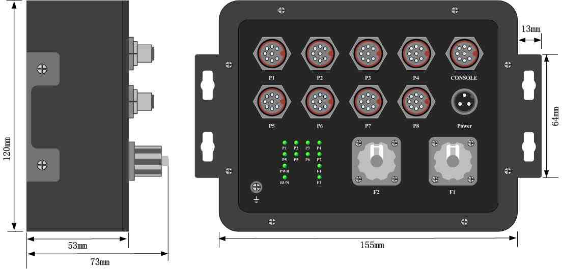 | 电源: 电源端子: M12 满载时的功率消耗: < 10w (Poe:<240w) 过载保护: 支持 反向连接保护: 支持 冗余保护: 支持 物理特性: 外壳: 金属,无风扇 保护等级: IP67 尺寸:155mm x 120mm x 73mm(W×D×H) 重量: 4.3kg 安装方式: 壁挂安装 认证 CE, FCC, RoHS 平均无故障时间 360,000 hrs 保修期 3 年 环境条件 工作温度:-40至85°C 储存温度:-40至85°C 环境相对湿度:5至95%(无凝露) |