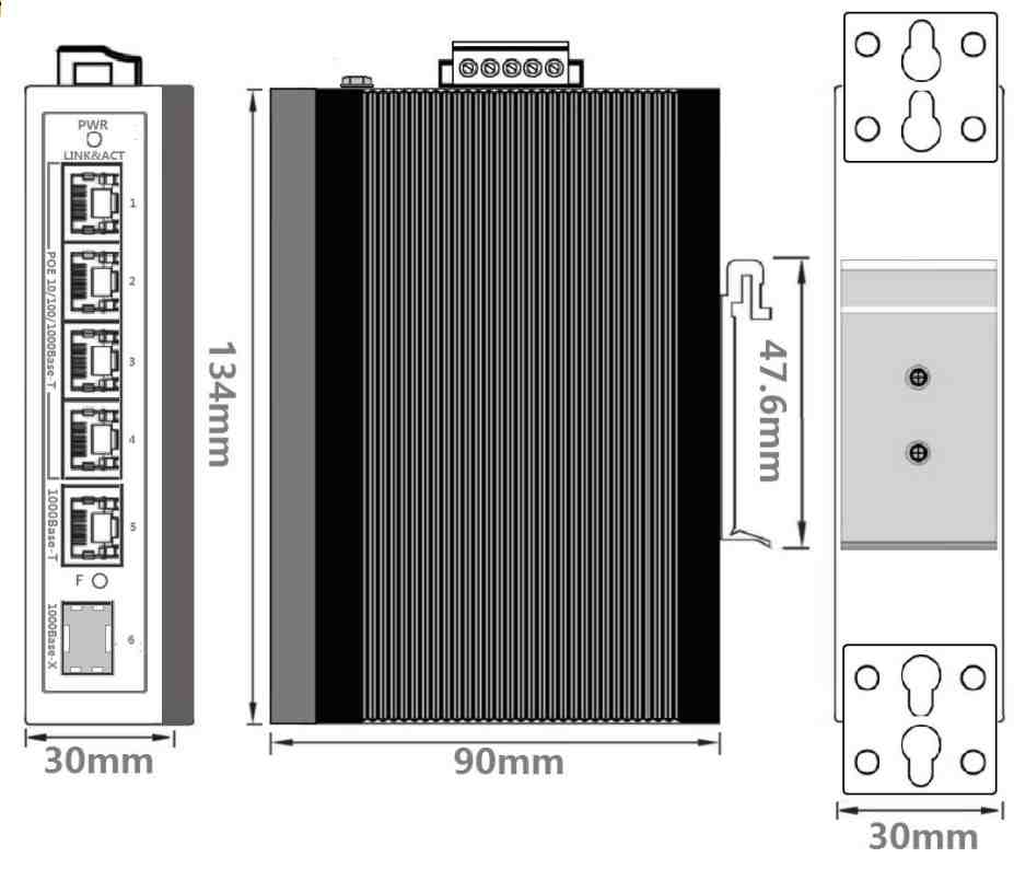 过载保护: 支持 反接保护: 支持 冗余保护: 支持 POE 指标 IEEE 802.3.af:Supported 15.4W/port IEEE 802.3.af:Supported 30W/port 物理特征 外壳: 金属,无风扇 保护等级: IP40 尺寸:30mmx134mmx90mm(W×H×D) 重量:0.50kg 安装: DIN导轨或壁挂安装 工业标准 EMI: FCC CFR47 Part 15, EN55022/CISPR22, Class A EMS: IEC61000-4-2 (ESD): ±8kV (contact), ±15kV (air) IEC61000-4-3 (RS): 10V/m (80MHz-2GHz) IEC61000-4-4 (EFT): Power Port: ±4kV; Data Port: ±2kV |