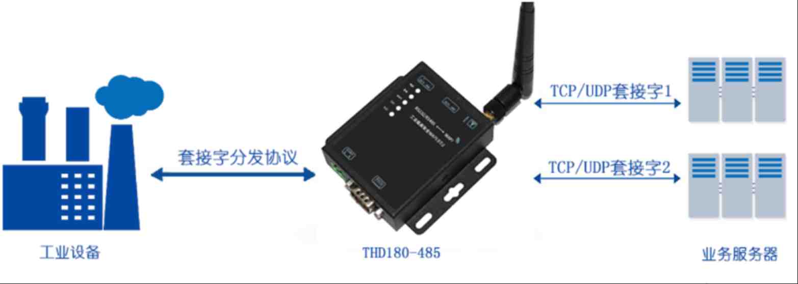 | 5、套接字分发模式 DTU180-485-WAPI支持套接字分发协议,可通过特定的网络协议将数据发往不同的套接字,也可以将不同 的套接字接收的数据增加包头和包尾进行区分。 |
